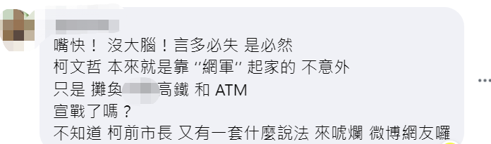 有人说,柯文哲嘴快!没大脑!言多必失是必然。他本来就是靠“网军”起家的 ,不意外,只是瘫痪大陆高铁和ATM,“宣战了吗?”↓