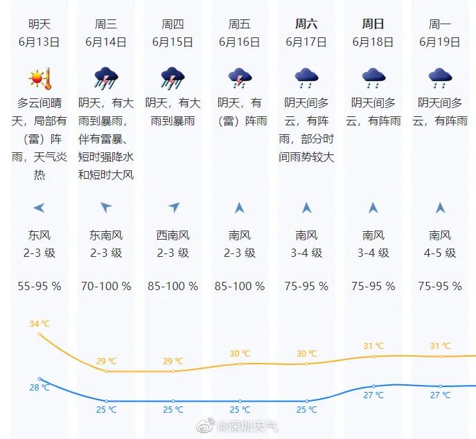 5.由于本次过程持续时间长,随时效加长预报不确定性也随之增大,请注意通过深圳天气APP、官方微博微信和官网等渠道及时查询最新预警预报信息。