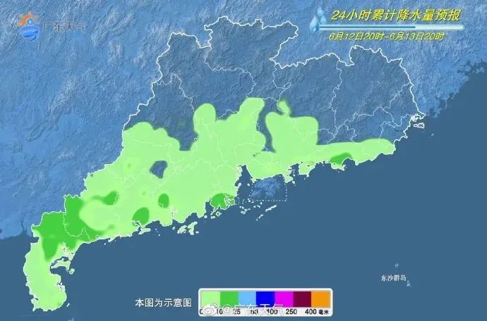 6月12日,南部沿海市县有中到大雨局部大暴雨,雷雨时局地伴有短时强降水、雷电、6-8级短时大风等强对流天气,其余市县天气炎热。