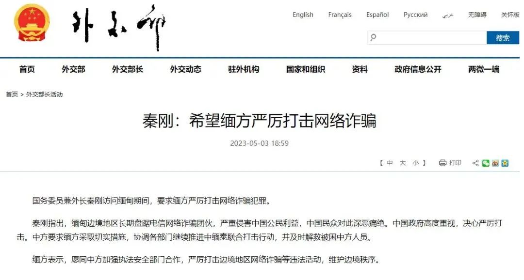 今年5月初,国务委员兼外交部长秦刚访问缅甸期间,就曾郑重向缅方提出:“缅甸边境地区长期盘踞电信网络诈骗团伙,严重侵害中国公民利益,中国民众对此深恶痛绝。中国政府高度重视,决心严厉打击。”