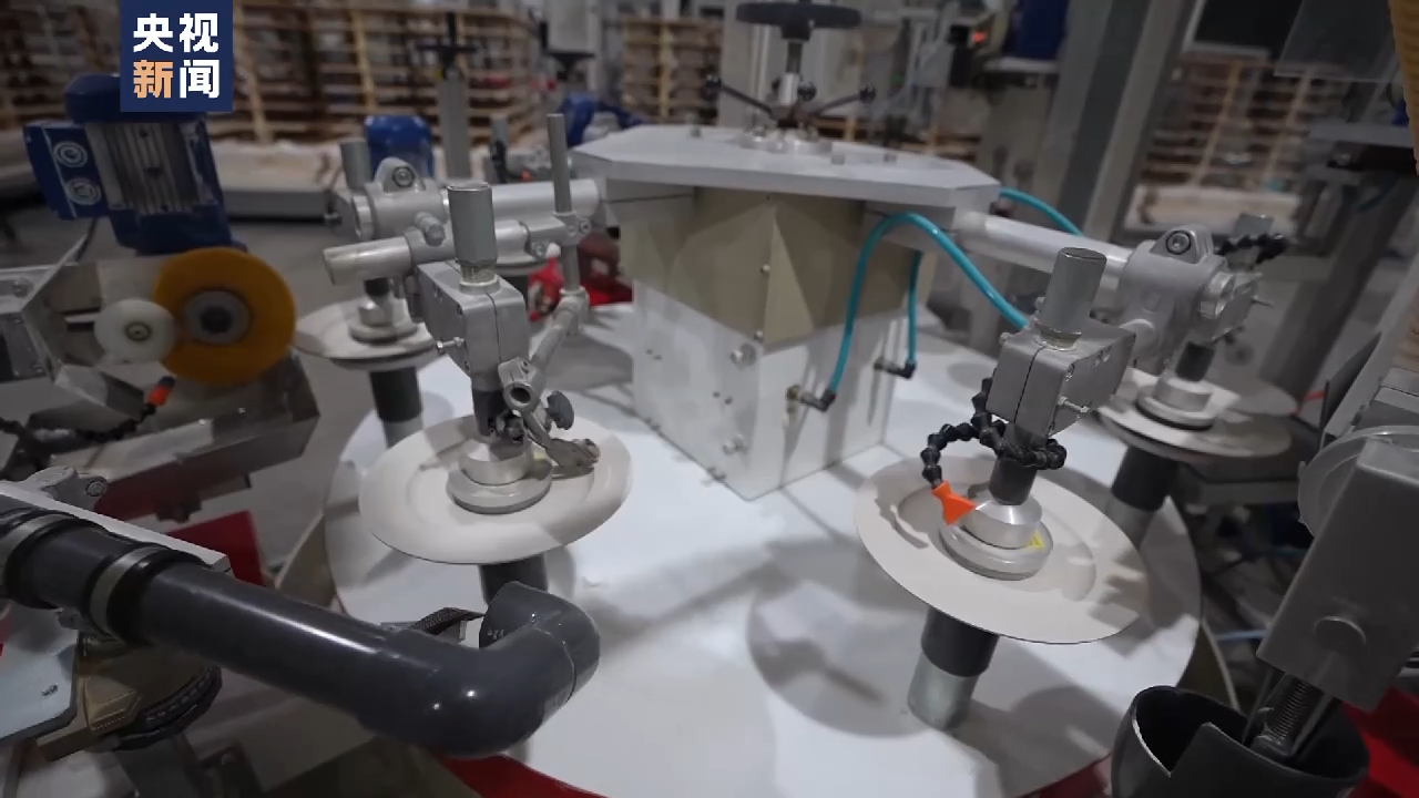 总台记者 殷一元:这是一台等静压设备,它最大的特点就是快,短短几秒内就可以做出一件完整的瓷坯。不同于我们理解的在制作之前需要将瓷泥放入到模具里进行滚压才能成型,这台设备通过300公斤的压力就可以将这些干粉直接压制成型。由于这些干粉的吸水率比较低,所以就直接省去了烘干的环节,缩短了三分之一的制作流程。