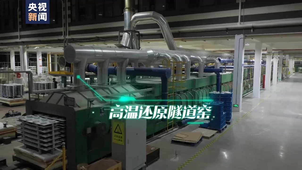 总台记者 殷一元:这个类似于火车车厢一样的大东西,名字叫高温还原隧道窑,光长度就有62米。原料经过成型、素烧、上釉等一系列工艺之后,一个个搭载产品的窑车就会自动进入隧道之内,经过14个小时1380℃的高温烧制,就完成化泥成瓷的蜕变,形成洁白如玉的精美瓷器。这样的隧道窑,整个企业有两座,日产量高达3万件。因为起燃一次的成本非常高,所以窑炉需要24小时运转,那么如何保证它的产能呢?