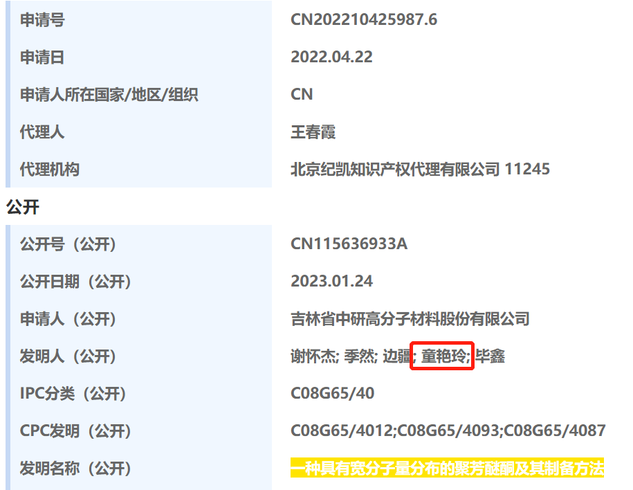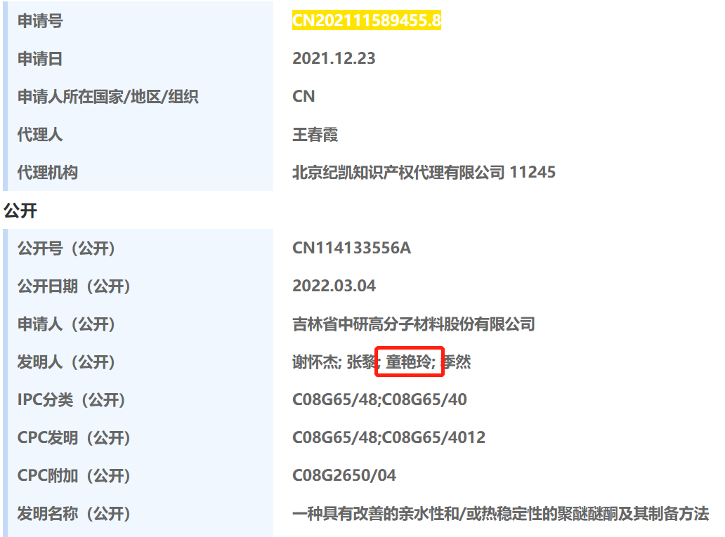 而在存在多位神秘外部人员个人股东的同时,中研股份多位核心技术人员却并不持有公司股份。中研股份在2020年9月,发布公告称,童艳玲离任总经理助理、研发部部长职位,离任日期为7月12日,童艳玲未持有公司股份。但是根据《国家知识产权局》检索信息显示,中研股份在2022年4月申请专利“一种具有宽分子量分布的聚芳醚酮及其制备方法”,其申报的发明人中仍有童艳玲;还有公司在2021年12月申请的专利“一种具有改善的亲水性/或热稳定性的聚芳醚酮及其制备方法” ,其申报的发明人中也有童艳玲,这两项专利申请时间均明显晚于童艳玲离任时间。