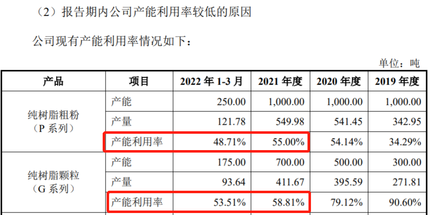 再来看中研股份的财务数据,招股书第163页披露的“公司主要产品的产能、产量及销量情况”显示,纯树脂粗粉(P系列)2022年度的产能利用率达71.4%,纯树脂颗粒(G系列)达72.92%。但是根据公司发布的《发行人及保荐机构关于审核问询函的回复》第83页披露的“报告期内公司产能利用率较低的原因”中则显示,纯树脂粗粉(P系列)、纯树脂颗粒(G系列)2022年度的产能利用率分别仅为55%和58.81%,显著低于招股说明书中披露的产量和产能利用率。
