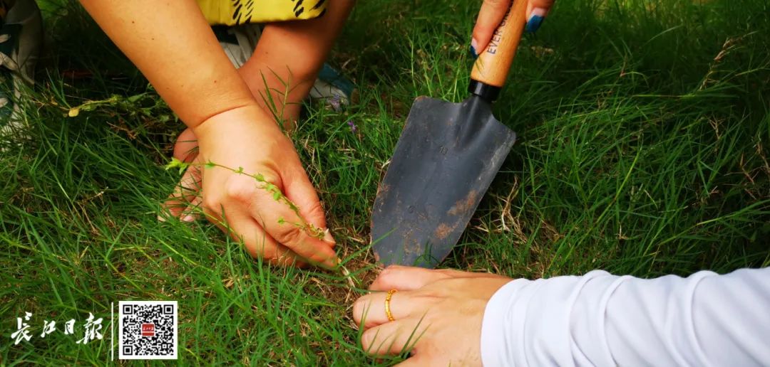 12日下午,吴琛岚和同事汪凯一起动手,将这些卵叶异檐花连根铲除。记者现场看到,这些卵叶异檐花高10厘米左右,一丛一丛的,长成一片。仔细一数,共有15株,其中4株开着紫色小花。它们不太起眼,很容易被当成普通杂草。