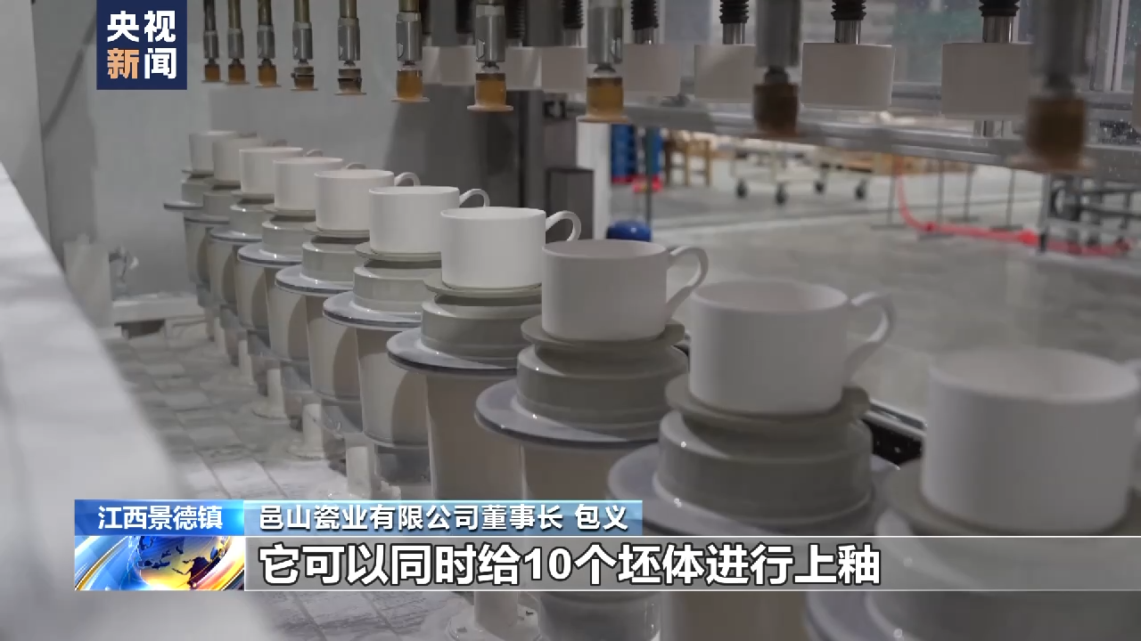 景德镇邑山瓷业有限公司董事长 包义:我们一条全自动化上釉生产线,它可以同时给10个坯体进行上釉。所以这台设备的产能可以达到每小时1500件,而相比于我们过去传统的人工上釉,可能一个工人一天也就做到1500件,它的效率得到大幅度的提升。同时通过这种自动化上釉的工艺,它会让我们的釉面更加均匀,釉面质量更好。