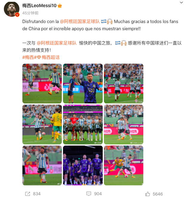 赛后,梅西在个人社交媒体发文,感谢所有中国球迷一直以来的热情支持。