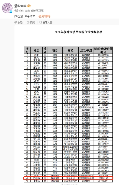 16日,清华大学官方社交媒体发布了保送推荐名单截图并写道:“我在清华等你来!@苏翊鸣”