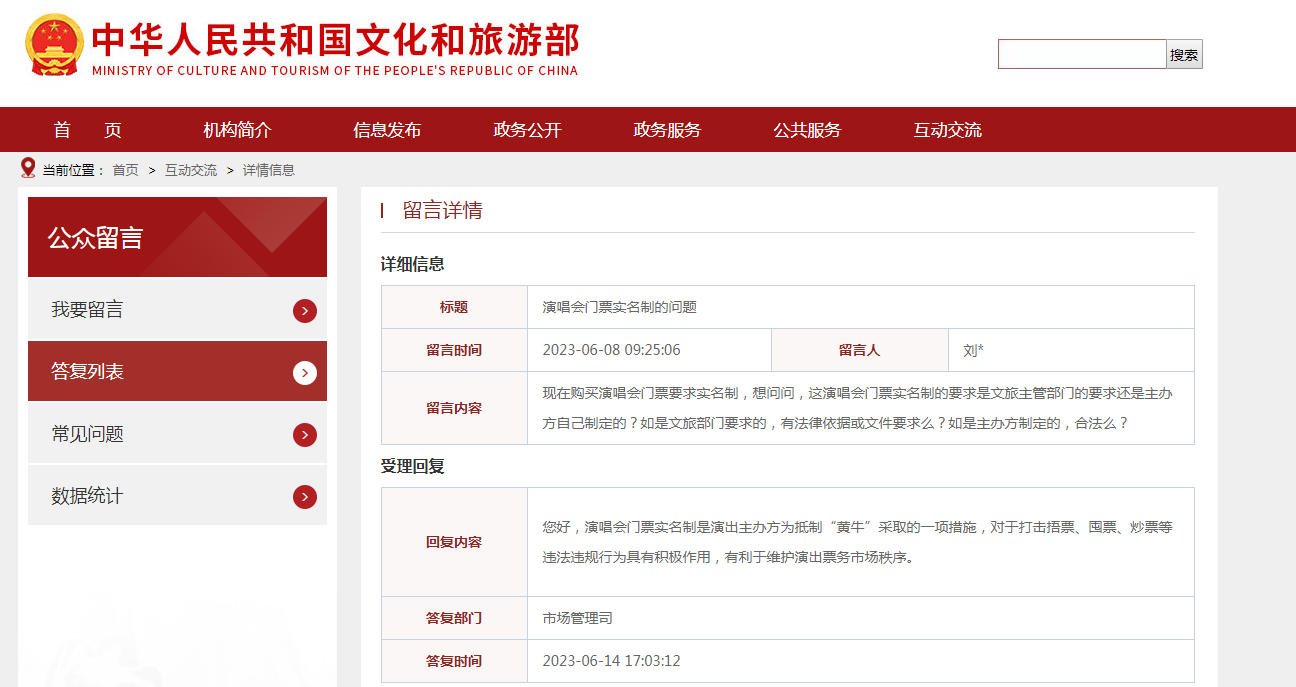 近日,有网友在文旅部官网留言提问:现在购买演唱会门票要求实名制是由哪个部门负责?有法律依据或文件要求吗?如是主办方制定的,合法吗?