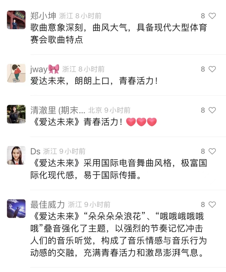 网友Stone点赞说:“《爱达未来》词曲相得益彰,大道至简,将亚运精神用简单好记的歌词传达出来,充满了青春和活力,非常适合杭州这次的亚运盛会。”