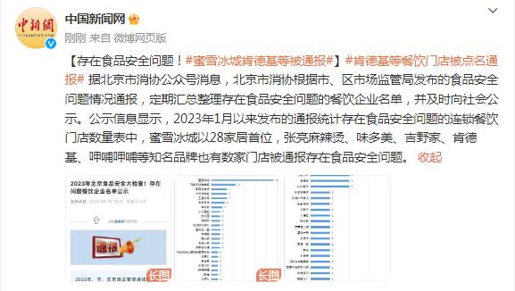 据北京市消协公众号消息,北京市消协根据市、区市场监管局发布的食品安全问题情况通报,定期汇总整理存在食品安全问题的餐饮企业名单,并及时向社会公示。公示信息显示,2023年1月以来发布的通报统计存在食品安全问题的连锁餐饮门店数量表中,蜜雪冰城以28家居首位,张亮麻辣烫、味多美、吉野家、肯德基、呷哺呷哺等知名品牌也有数家门店被通报存在食品安全问题。