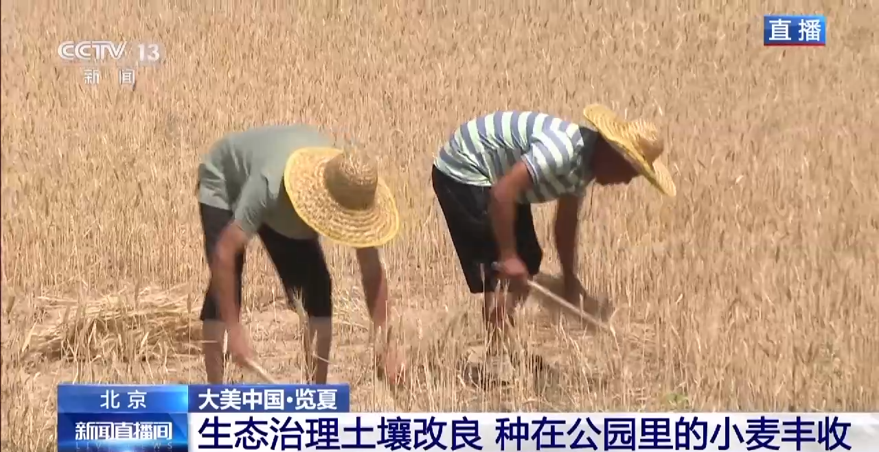 一片水田中的水稻长势良好,这些都是由家庭体验栽种完成的。而再远处,是一片金色的麦浪,有两位工作人员正在收麦子,最近几天,北京各处麦田都已经开镰收割,种在公园里的小麦,您是否觉得比较少见呢?