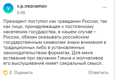 还有网友称,“总统那样做,就是一名俄罗斯公民应该做的,因为一个国家的常住居民,此处指俄罗斯,有义务以传统方式或法律规定方式关注俄罗斯国家标志。对我来说,在听到国歌时起立、安静听完国歌具有神圣意义”。↓