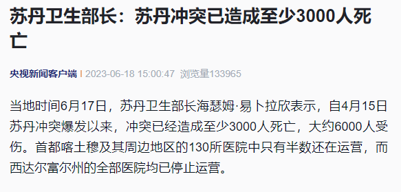 据央视新闻客户端消息,当地时间6月17日,苏丹卫生部长海瑟姆·易卜拉欣表示,自4月15日苏丹冲突爆发以来,冲突已经造成至少3000人死亡,大约6000人受伤。首都喀土穆及其周边地区的130所医院中只有半数还在运营,而西达尔富尔州的全部医院均已停止运营。