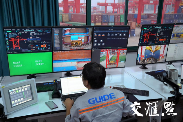 来到中控楼的远程控制室,操作员正坐在屏幕前熟练地推动操纵杆。数百米开外,40英尺的集装箱被龙门吊稳稳抓起后准确无误地放置在了指定地点,整个过程不过半分钟。“以前,操作员需要沿狭窄的铁梯爬到20米高空,在一个不足3平方米的操作室内一坐一天。现在他们只需在中控室远程监控,执行开闭锁的动作。作业环境和劳动强度的改善,也能有效避免因疲劳而产生安全风险。”工作人员告诉记者。