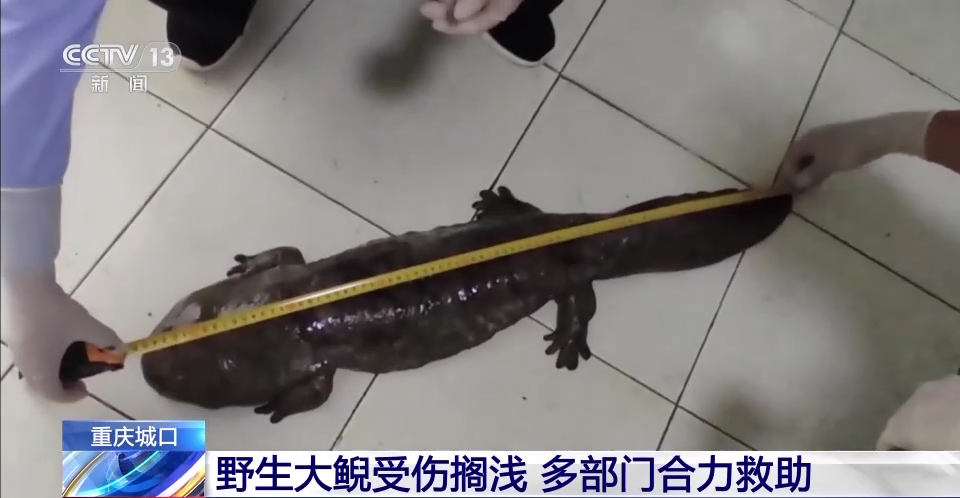 在仔细检查后救助人员发现,这条野生大鲵体长87厘米、体重4.17公斤,是成年大鲵。救助人员发现,它的右前肢轻微挫伤,便立即对其伤口进行处理。救助人员推测,这条野生大鲵很可能是因为近期降雨,导致它栖息地的河谷水位上涨,脱离了原栖息处,从而误入附近河边,目前,由于其受伤以及降雨导致的水域环境变化等因素,暂不具备放生条件。
