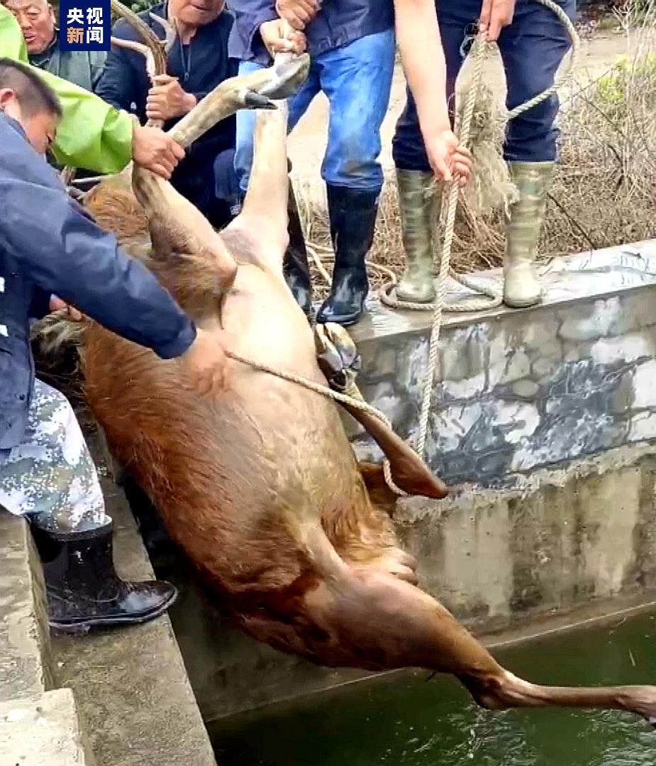事发地点为路边的一条深水渠,宽约4米,深约3米,岸边壁直光滑,麋鹿无法自行上岸。麋鹿保护区工作人员决定先为麋鹿注射麻醉剂,然后用绳子捆住,再由众人合力将麋鹿拉上岸。由于麋鹿体型巨大,且数量较多,众人奋力救援2个小时,才将5头被困麋鹿全部从水渠里救出。救援人员立即给拉上岸的麋鹿注射鹿醒宁,5头麋鹿渐渐苏醒,休憩了一会儿后慢慢奔向远方。