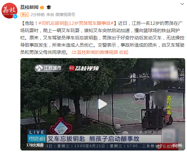 近日,江苏一名12岁的男孩在广场玩耍时,爬上一辆叉车玩耍,谁知叉车突然启动加速,撞向篮球场的铁丝网护栏。原来,叉车驾驶员停车后忘拔钥匙,男孩出于好奇拧动后发动叉车,无法操控导致事故发生,所幸未造成人员伤亡。交警表示,事故所造成的损失,由叉车驾驶员和男孩父母共同承担。