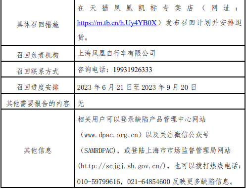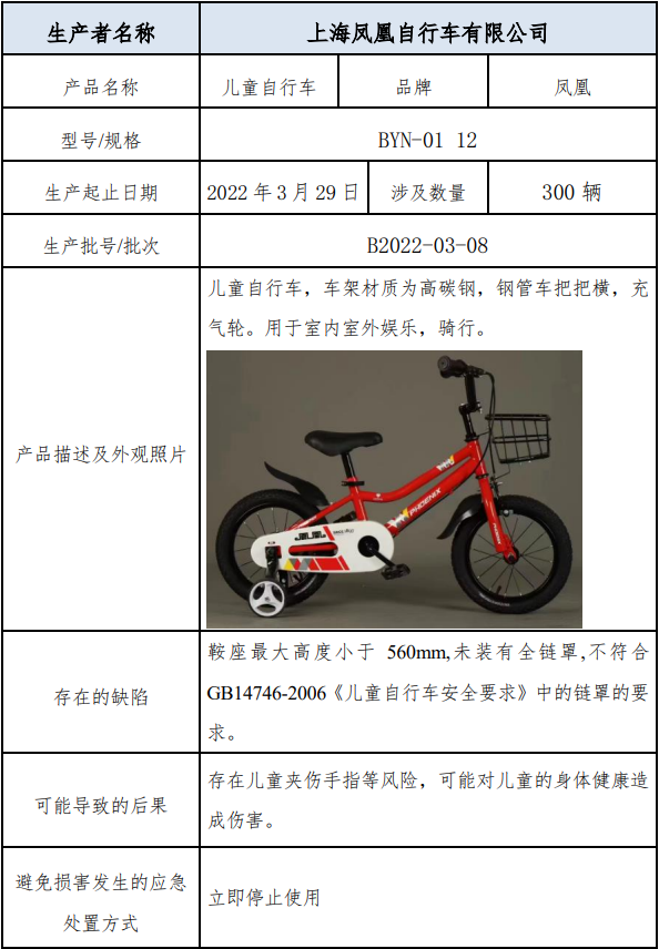 上海凤凰自行车有限公司自2023年6月21日至2023年9月20日召回2022年3月29日生产的凤凰牌儿童自行车,共计300辆。