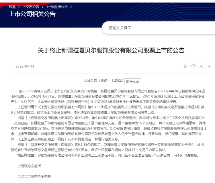 2022年,4月14日晚,新疆拉夏贝尔服饰股份有限公司公告表示,上交所决定终止公司A股股票上市,自2022年4月22日起,公司A股股票进入退市整理期。直至今天,正式进入破产清算,招募投资人。