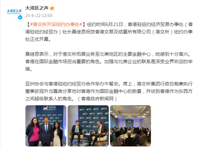 纽约时间6月21日,香港驻纽约经济贸易办事处(香港驻纽约经贸办)处长聂继恩祝贺香港交易及结算所有限公司(港交所)纽约办事处正式开幕。