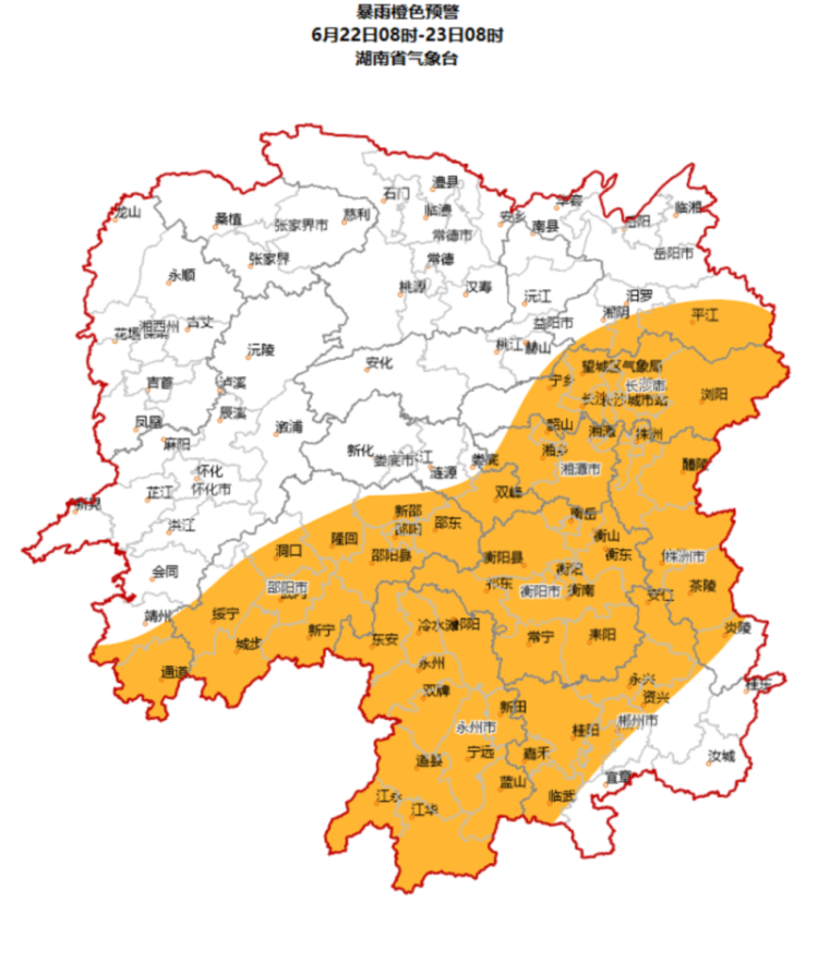 湖南省气象台6月22日6时发布暴雨橙色预警: