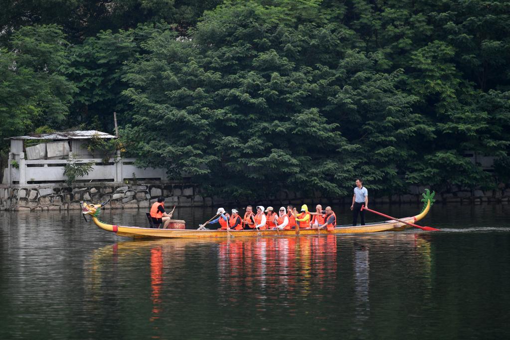 不远处的水面上,游客正在体验划龙舟,鼓点气势昂扬,木桨随着号子声整齐入水。船上的舵手和鼓手都是本村村民,长期以来,这对搭档分文不取,闲暇时间自愿带领游客体验龙舟,负责教学和保障安全。