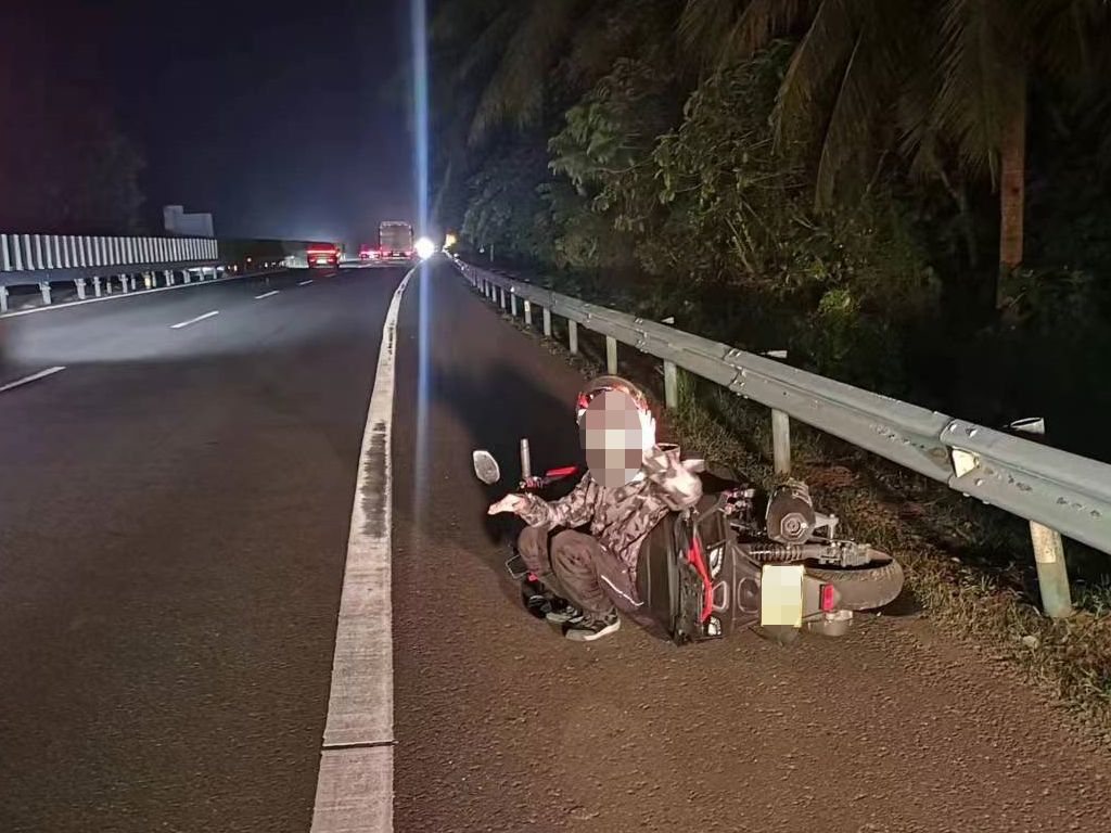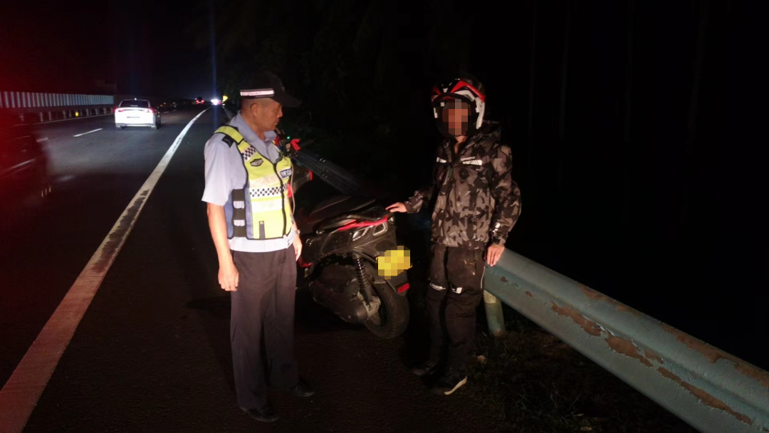 6月21日20时30分许,琼海公安交警接到群众报警称,在G98海南环岛高速三亚往海口方向76公里处,有一辆摩托车摔倒在应急车道,且摩托车驾驶人在应急车道逗留,并未采取任何安全防护措施,情况十分危险!接警后,琼海公安交警立即组织警力赶往现场,并迅速在应急车道建立安全警示措施,联系拖车公司将车辆拖移出高速公路,摩托车驾驶人林某则搭乘警车撤离高速公路。