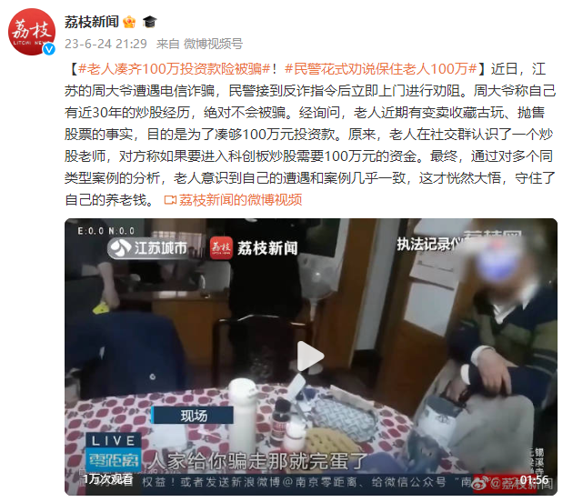 近日,江苏的周大爷遭遇电信诈骗,民警接到反诈指令后立即上门进行劝阻。周大爷称自己有近30年的炒股经历,绝对不会被骗。经询问,老人近期有变卖收藏古玩、抛售股票的事实,目的是为了凑够100万元投资款。原来,老人在社交群认识了一个炒股老师,对方称如果要进入科创板炒股需要100万元的资金。最终,通过对多个同类型案例的分析,老人意识到自己的遭遇和案例几乎一致,这才恍然大悟,守住了自己的养老钱。