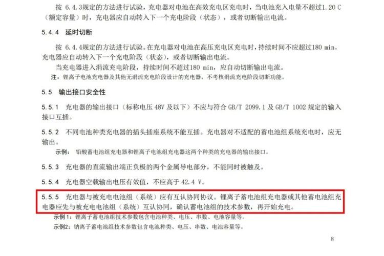 第5.5.5条规定,充电器与被充电电池组(系统)应有互认协同协议。锂离子蓄电池组充电器或其他蓄电池组充电器应先与被充电电池组(系统)互认协同,确认蓄电池组的技术参数,再开始充电 。