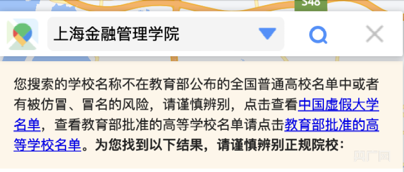记者又通过某地图导航搜索发现,上海30所“野鸡大学”均查询不到具体地址。部分学校还会出现“您搜索的学校名称不在教育部公布的全国普通高校名单中”等相关提示。