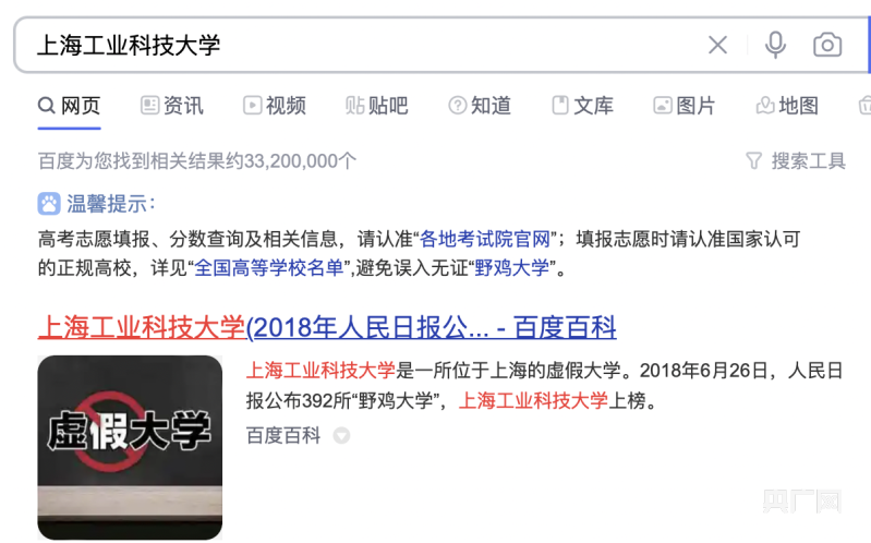 记者通过某搜索引擎发现,当前上海30所“野鸡大学”均查询不到官网网站与报考信息。值得一提的是,搜索这些“野鸡大学”时还会出现“该校是一所位于上海的虚假大学”等相关提示。