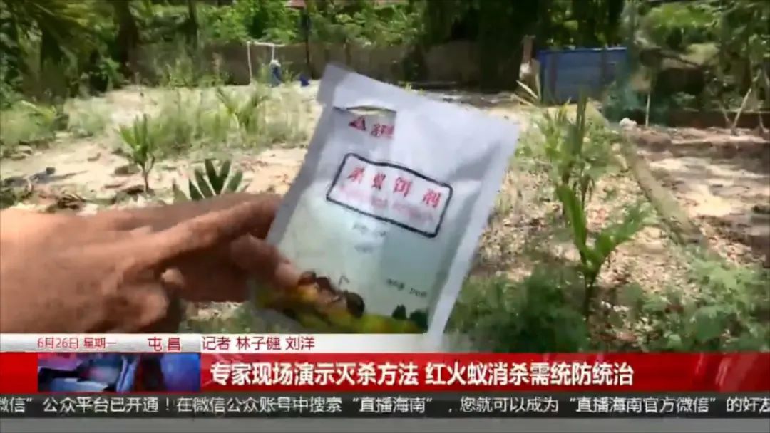采访当天,记者将情况反映给屯昌县农业农村局。随后屯昌县农业技术和机械化事务中心的工作人员,带着杀蚁饵剂来到新昌村委会。工作人员介绍,经核实,这些咬伤村民们的蚂蚁,正是外来入侵物种红火蚁。 现场,工作人员也为村民准备了消杀的药剂,“蚂蚁就是走到这里面,在里面做窝,做窝以后它只能从这里面出来,所以说我们要看,看红火蚁从哪个地方出来,出来以后你就在这里撒,给它吃,带进去吃,要自己看的,因为这里都是水泥地板,它不可能筑成那个蚁巢出来,看不到,所以说隐藏得很深,我们只有要这种茚虫威,给它带进去以后,把它那个蚁后杀死,你要是说要那个高效氯氰菊酯就达不到这个目的,只能把表面上的杀死。”