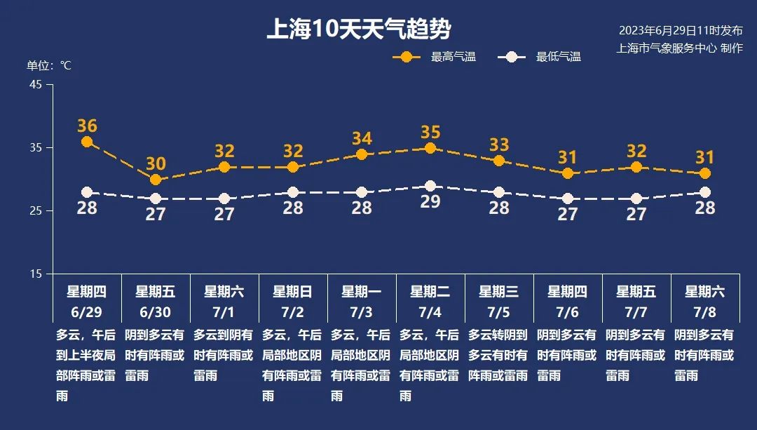 29-30日的强对流天气过后,本市处在副热带高压边缘,仍有阵雨或雷雨的天气。下周随着副热带高压北抬,转为多云为主,多午后阵雨或雷雨。气温整体较高,高温短暂冒头,体感总体偏潮湿闷热。请继续做好防暑防霉变的工作。