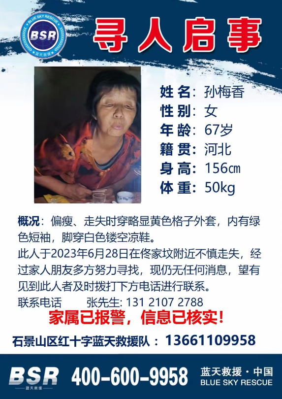 张先生表示,自己的母亲名叫孙梅香,今年已经67岁了,走失时老人穿了一件格子外套,内有绿色短袖T恤,脚穿白色镂空凉鞋。记者了解到,老人离家时手机、身份证、老年卡等物品都未携带。“老人身高156厘米,体重50千克,身体基本健康,但患有老年痴呆症,记忆力不好。”张先生说,根据警方提供的线索,老人最后现身的时间是昨天下午5时30分,从位于石景山的地铁6号线西黄村站旁向北走去。“白天天气这么热,也不知老人有没有吃过东西、喝过水,家人现在非常着急,如果有人看到我母亲,请马上和我联系,我们很担心。”张先生焦急地说。