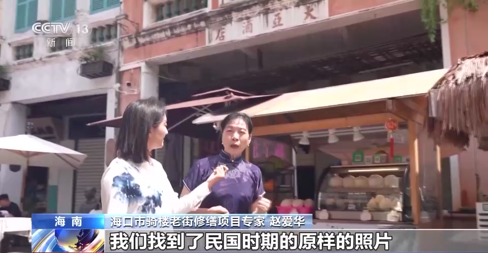 海口市骑楼老街修缮项目专家 赵爱华:我们找到了民国时期的原样的照片,然后对它的材料进行了分析,对它的色彩也进行了分析,那么现在做的砖红色的色彩,就是它原本建筑的色彩。