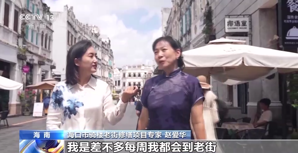 海口市骑楼老街修缮项目专家 赵爱华:我是差不多每周都会到老街来走一走看一看,看到外地游客和一些国际友人来这里打卡,真的是特别的高兴。包括一些老外来了,就说喜欢在这发呆喝咖啡,在街边喝一个椰子就特别享受的这种感觉。