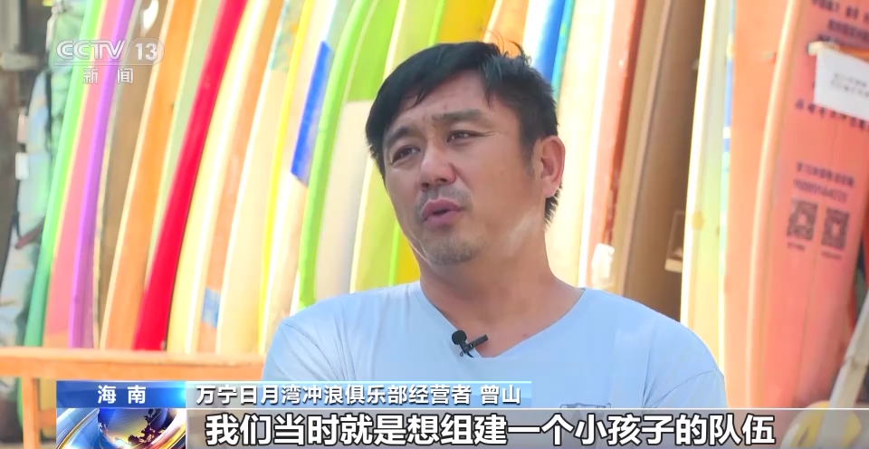万宁日月湾冲浪俱乐部经营者 曾山:我们当时想组建一个小孩子的队伍,就是从娃娃抓起。去跟万宁市政府打过报告,万宁市政府也很支持,特别高效。当时我记得也给了有30多万,然后我们记得当时还有配了有摩托艇什么的。