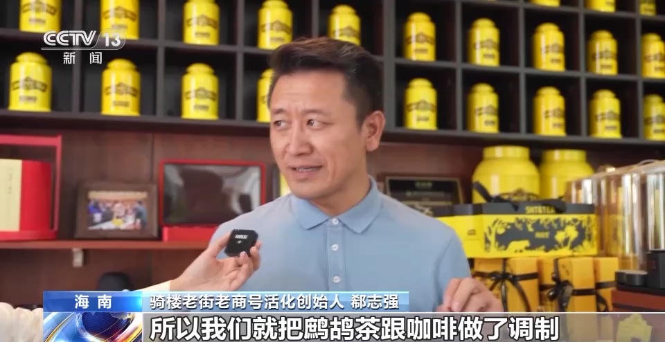 骑楼老街老商号活化创始人 郗志强:所以我们就把鹧鸪茶跟咖啡做了调制。根据骑楼老街的主题,我们开发出来的鹧鸪南洋调,在这个老街炎热的夏天,喝上那么一口冰爽的咖啡跟鹧鸪茶拼配的鹧鸪南洋调,是非常有一种穿越感的。