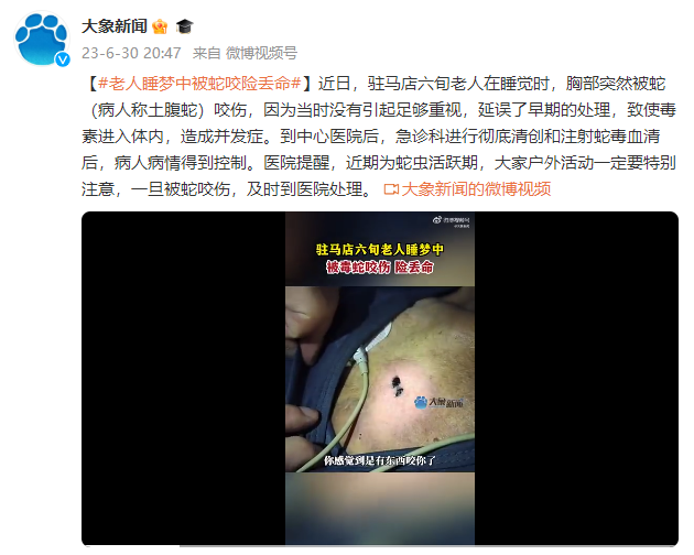 近日,驻马店六旬老人在睡觉时,胸部突然被蛇(病人称土腹蛇)咬伤,因为当时没有引起足够重视,延误了早期的处理,致使毒素进入体内,造成并发症。到中心医院后,急诊科进行彻底清创和注射蛇毒血清后,病人病情得到控制。医院提醒,近期为蛇虫活跃期,大家户外活动一定要特别注意,一旦被蛇咬伤,及时到医院处理。