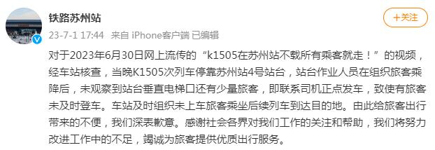 对于2023年6月30日网上流传的“k1505在苏州站不载所有乘客就走!”的视频,经车站核查,当晚K1505次列车停靠苏州站4号站台,站台作业人员在组织旅客乘降后,未观察到站台垂直电梯口还有少量旅客,即联系司机正点发车,致使有旅客未及时登车。车站及时组织未上车旅客乘坐后续列车到达目的地。由此给旅客出行带来的不便,我们深表歉意。感谢社会各界对我们工作的关注和帮助,我们将努力改进工作中的不足,竭诚为旅客提供优质出行服务。