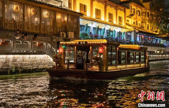 坐在秦淮河上古色古香的画舫里,两岸灯彩和实景表演连绵不断,处处都有惊喜:拐个河湾可能会与中国古代美人碰面,绕过廊桥就能与“四大才子”撞个正着,河上画舫里的游客与河岸边正在直播的网红博主互相打着招呼……十里秦淮河,处处洋溢着欢乐的假日气氛。