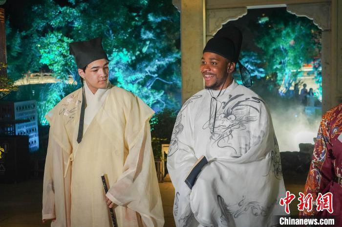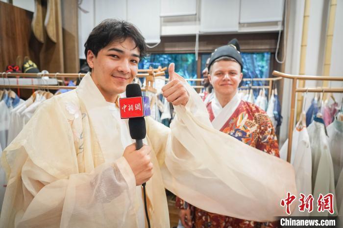 “我最喜欢的中国诗人就是李白,穿上这身衣服让我很想背一首他的诗。”来自赤道几内亚的青年博主马图身着一身白色水墨轻纱夏装,摇着纸扇、捧着线装书笑道,“这是我第一次穿中国古装,这衣服看起来特别有文化,也很舒适。”
