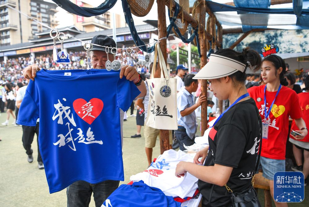 ↑7月1日,游客在贵州“村超”足球赛场旁的文创摊位选购文化衫。新华社记者 杨文斌 摄