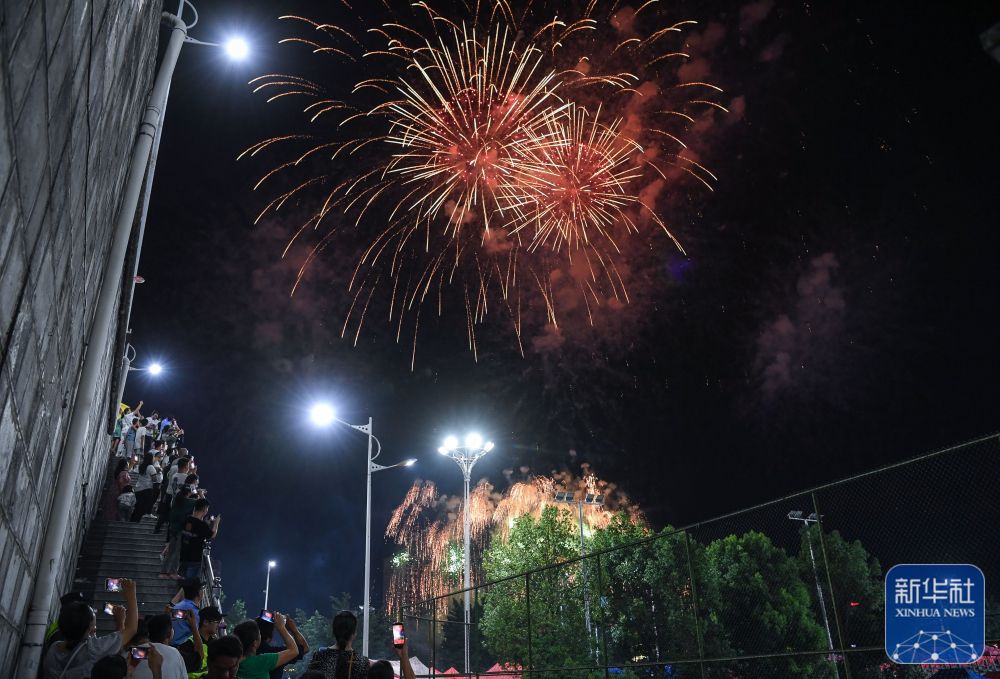 ↑7月1日,游客在贵州“村超”足球赛场旁观看焰火表演。新华社记者 杨文斌 摄
