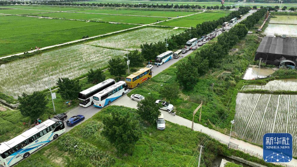 ↑这是7月2日拍摄的在贵州省黔东南苗族侗族自治州榕江县古州镇三宝侗寨古榕群景区的旅游大巴(无人机照片)。新华社发(李长华 摄)