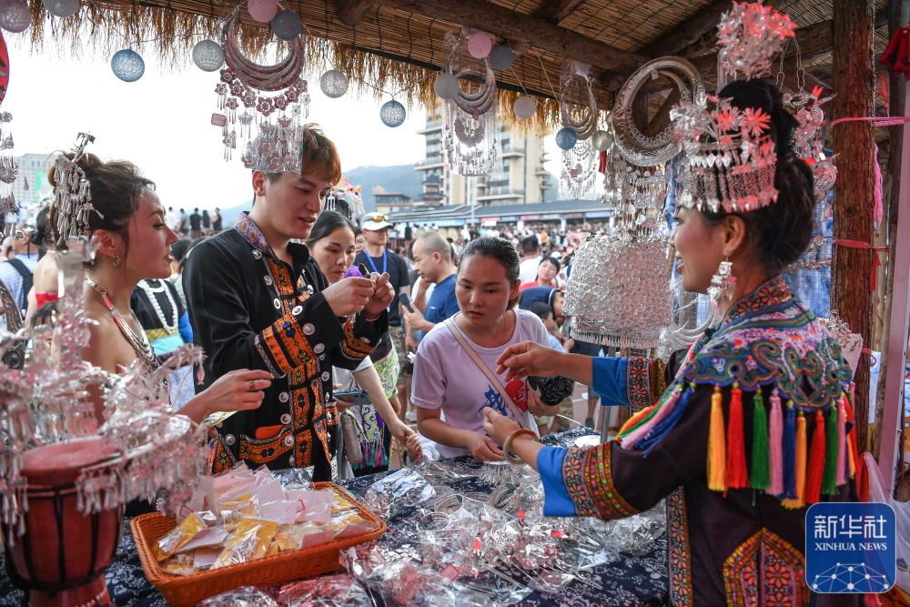 ↑7月1日,游客在贵州“村超”足球赛场旁的文创摊位选购银饰。新华社记者 杨文斌 摄
