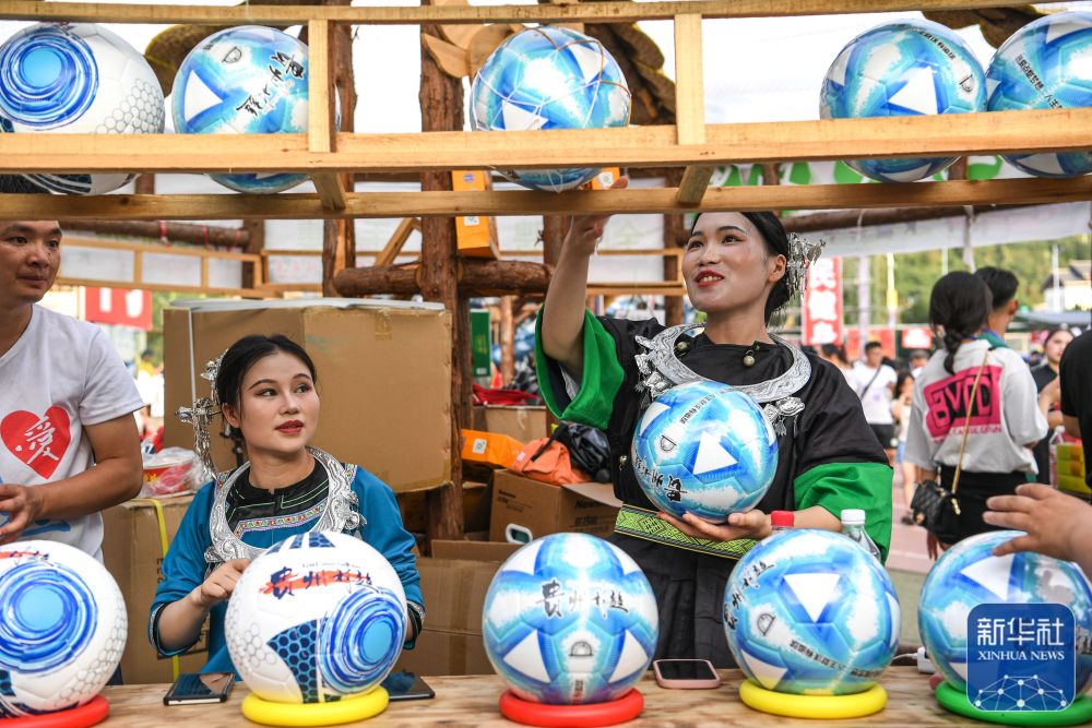 ↑7月1日,村民在贵州“村超”足球赛场旁的文创摊位整理足球。新华社记者 杨文斌 摄