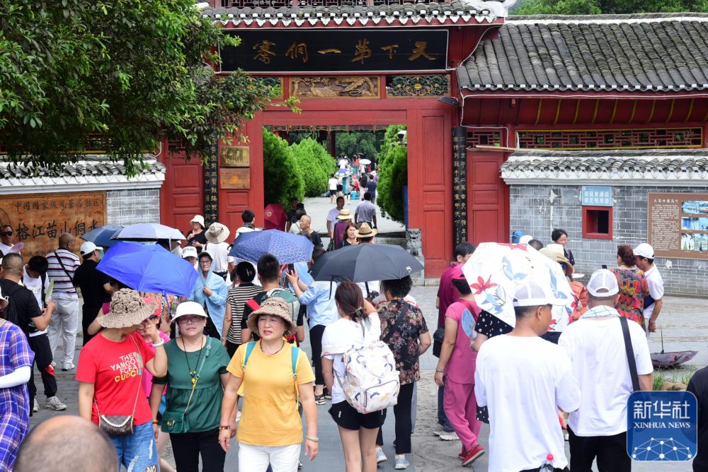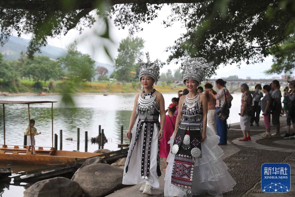 ↑7月2日,游客在贵州省黔东南苗族侗族自治州榕江县古州镇三宝侗寨古榕群景区游玩。新华社发(李长华 摄)