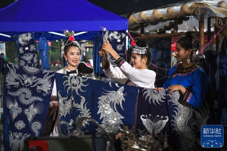 ↑7月1日,少数民族姑娘在贵州“村超”足球赛场旁设置的文创摊位整理文创饰品。新华社记者 杨文斌 摄